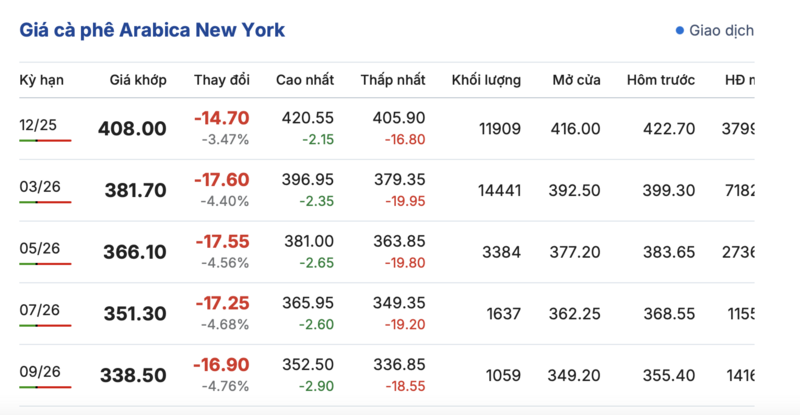 Tương tự, trên sàn New York, giá cà phê Arabica cũng ghi nhận sự giảm giá đồng loạt trong các kỳ giao hàng. Kỳ giao tháng 12/2025 giảm 14,7 cent/lb, xuống mức 408,0 cent/lb. Hợp đồng giao tháng 9/2026 giảm mạnh 16,9 cent/lb, đạt mức 338,5 cent/lb.