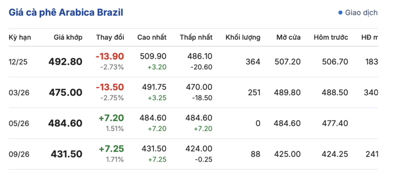 Kết thúc phiên giao dịch gần nhất, giá cà phê Arabica Brazil biến động trái chiều so với phiên giao dịch trước. Cụ thể: kỳ giao hàng tháng 12/2025 là 492,8 cent/lb, giảm 13,9 cent/lb so với phiên giao dịch trước. Kỳ giao hàng tháng 9/2026 tăng 7,25 cent/lb, lên mức 431,5 cent/lb.