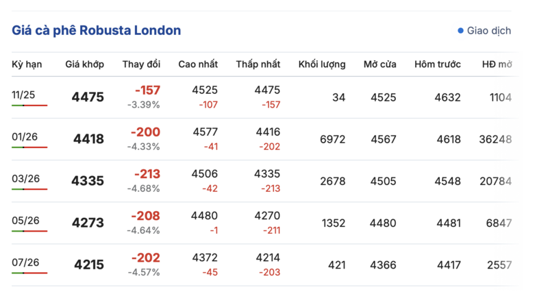 Kết thúc phiên giao dịch gần nhất, giá cà phê Robusta tại London đồng loạt giảm mạnh trong các kỳ giao hàng. Cụ thể, kỳ giao tháng 11/2025 giảm mạnh 157 USD/tấn, xuống mức 4475 USD/tấn. Trong khi hợp đồng giao kỳ hạn tháng 7/2026 giảm sâu 202 USD/tấn, xuống mức 4215 USD/tấn.