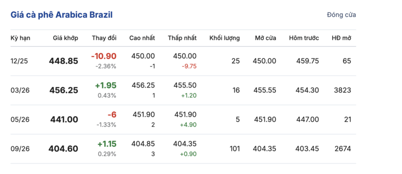 Kết thúc phiên giao dịch gần nhất, giá cà phê Arabica Brazil biến động trái chiều so với phiên giao dịch trước. Cụ thể: kỳ giao hàng tháng 12/2025 đạt mức 448,85 cent/lb, giảm mạnh 10,9 cent/lb so với hôm qua. Trái lại, kỳ giao hàng tháng 5/2026 lại tăng nhẹ 1,15 cent/lb, đạt mức 404,6 cent/lb.