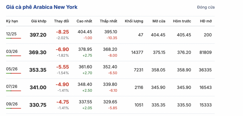 Tương tự, trên sàn New York, giá cà phê Arabica cũng ghi nhận giảm mạnh liên tục trong các kỳ giao hàng. Cụ thể, kỳ giao tháng 12/2025 giảm 8,25 cent/lb, đạt mức 397,2 cent/lb. Hợp đồng giao tháng 9/2026 giảm 4,75 cent/lb, đạt mức 330,75 cent/lb.