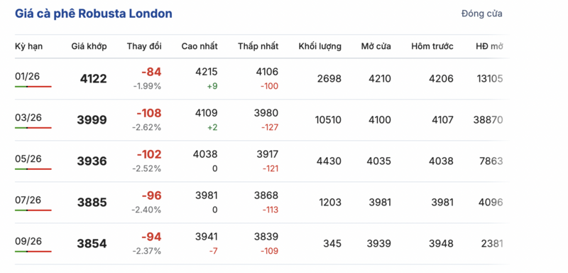 Kết thúc phiên giao dịch gần nhất, giá cà phê Robusta tại London giảm đồng loạt qua các kỳ giao hàng. Cụ thể, kỳ giao tháng 1/2026 giảm 84 USD/tấn, đạt mức 4122 USD/tấn. Trong khi hợp đồng giao kỳ hạn tháng 9/2026 giảm 94 USD/tấn, xuống mức 3845 USD/tấn.