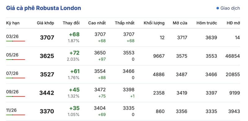 Cụ thể, kết thúc phiên giao dịch gần nhất, giá cà phê Robusta tại London ghi nhận phiên tăng giá đồng loạt trong các kì giao hàng. Trong đó, kỳ giao tháng 1/2026 tăng 68 USD/tấn, lên mức 3.707 USD/tấn. Tương tự, hợp đồng giao kỳ hạn tháng 11/2026 cũng tăng nhẹ 35 USD/tấn, lên mức 3.370 USD/tấn.