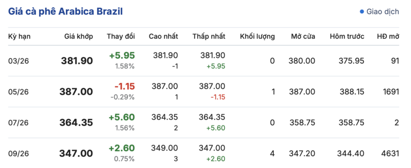 Kết thúc phiên giao dịch gần nhất, giá cà phê Arabica trên sàn Brazil ghi nhận phiên biến động trái chiều trong các kỳ giao hàng. Cụ thể: kỳ hạn tháng 3/2026 đạt mức 381,9 cent/lb, tăng mạnh 5,95 cent/lb so với hôm qua. Trái chiều, kỳ giao hàng tháng 5/2026 ghi nhận giảm nhẹ 1,15 cent/lb, xuống mức 387,0 cent/lb.