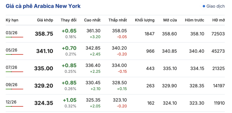 Tương tự, trên sàn New York, giá cà phê Arabica cũng ghi nhận phiên tăng giá liên tục trong các kỳ giao hàng. Cụ thể, kỳ giao tháng 3/2026 tăng nhẹ 0,65 cent/lb, đạt mức 358,75 cent/lb. Tương tự, hợp đồng giao tháng 12/2026 cũng ghi nhận tăng 1,05 cent/lb, lên mức 324,35 cent/lb.