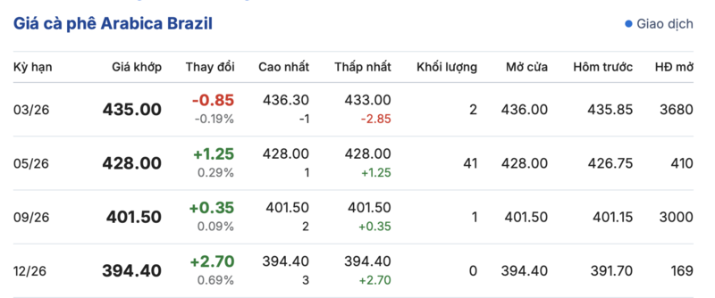 Kết thúc phiên giao dịch gần nhất, cà phê Arabica Brazil ghi nhận phiên biến động trái chiều trong các kỳ giao hàng. Cụ thể: kỳ hạn tháng 3/2026 đạt mức 435,0 cent/lb, giảm nhẹ 0,85 cent/lb so với hôm qua. Kỳ giao hàng tháng 12/2026 lại đảo chiều tăng 2,7 cent/lb, đạt mức 394,4 cent/lb.