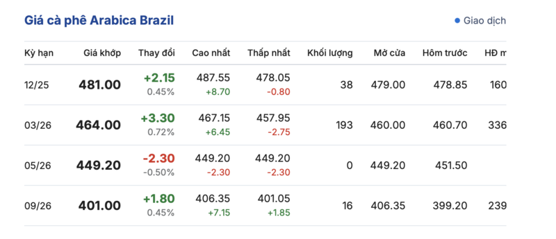 Kết thúc phiên giao dịch gần nhất, giá cà phê Arabica Brazil biến động trái chiều so với phiên giao dịch trước. Cụ thể: kỳ giao hàng tháng 12/2025 là 481,0 cent/lb, tăng 2,15 cent/lb so với phiên giao dịch trước. Kỳ giao hàng tháng 5/2026 giảm 2,3 cent/lb, xuống mức 449,2 cent/lb.