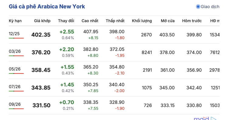 Trong khi đó, trên sàn New York, giá cà phê Arabica lại ghi nhận sự tăng giá đồng loạt trong các kỳ giao hàng. Kỳ giao tháng 12/2025 tăng 2,55 cent/lb, lên mức 402,35 cent/lb. Hợp đồng giao tháng 9/2026 cũng tăng 0,7 cent/lb, đạt mức 331,5 cent/lb.