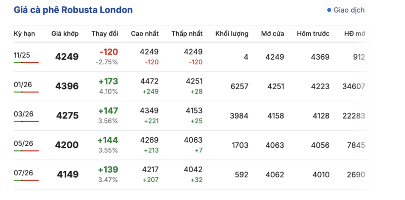 Kết thúc phiên giao dịch gần nhất, giá cà phê Robusta tại London biến động trái chiều trong các kỳ giao hàng. Cụ thể, kỳ giao tháng 1/2025 đi ngang, đạt mức 4249 USD/tấn. Trong khi hợp đồng giao kỳ hạn tháng 7/2026 tăng mạnh 139 USD/tấn, đạt mức 4149 USD/tấn.