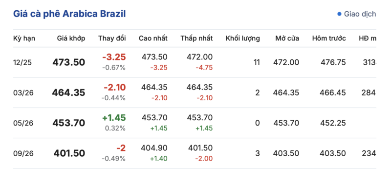 Còn tại sàn giao dịch Brazil, giá cà phê Arabica biến động trái chiều qua các kỳ giao hàng. Cụ thể, hợp đồng giao kỳ hạn tháng 12/2025 đạt 473,5 US cent/pound, giảm 0,67%. Hợp đồng giao kỳ hạn tháng 3/2026 xuống mức 464,35 US cent/pound, giảm 0,44% so với phiên giao dịch trước. Trái lại, hợp đồng giao kỳ hạn tháng 5/2026 tăng nhẹ 0,32% (1,45 US cent/pound), đạt mức 453,7 US cent/pound.