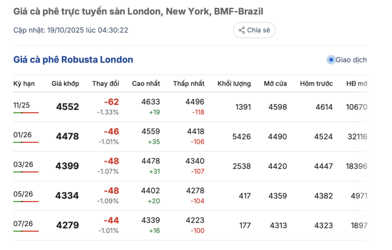 Kết thúc phiên giao dịch gần nhất, giá cà phê Robusta tại sàn London đồng loạt giảm. Cụ thể, hợp đồng kỳ giao tháng 11/2025 giảm 62 USD/tấn, ở mức 4552 USD/tấn. Kỳ giao tháng 1/2026 giảm 46 USD/tấn, ở mức 4478 USD/tấn.