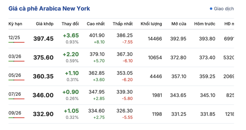 Trên sàn New York, giá cà phê Arabica giao tháng 12/2025 tăng 3,65 US cent/pound, ở mức 397,45 US cent/pound. Kỳ giao tháng 3/2026 tăng 2,2 US cent/pound, ở mức 371,15 US cent/pound.