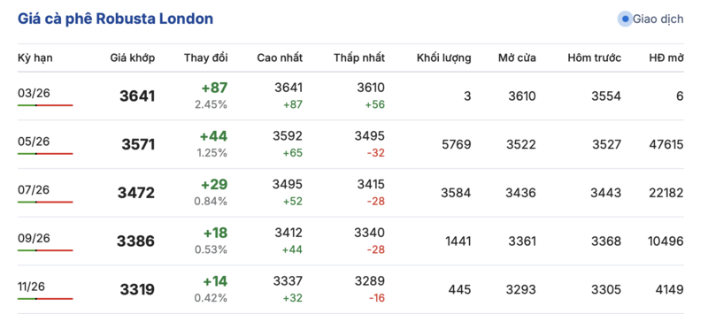 Cụ thể, kết thúc phiên giao dịch gần nhất, giá cà phê Robusta tại London tiếp tục ghi nhận phiên phục hồi, tăng đồng loạt. Trong đó, kỳ giao tháng 1/2026 tăng cao 87 USD/tấn, đạt mức 3.641 USD/tấn. Tương tự, hợp đồng giao kỳ hạn tháng 11/2026 cũng tăng nhẹ 14 USD/tấn, lên mức 3.319 USD/tấn.
