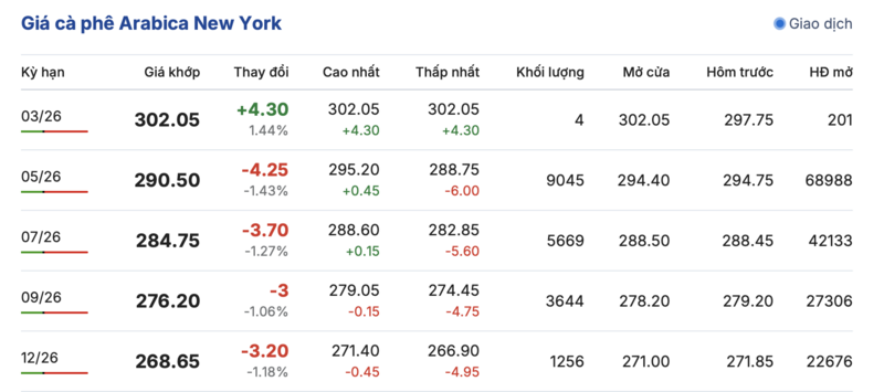 Trong khi đó, trên sàn New York, giá cà phê Arabica lại ghi nhận phiên biến động trái chiều trong các kỳ giao hàng. Cụ thể, kỳ giao tháng 3/2026 tăng 4,3 cent/lb, đạt mức 302,05 cent/lb. Trái lại, hợp đồng giao tháng 12/2026 lại giảm nhẹ 3,2 cent/lb, đạt mức 268,65 cent/lb.