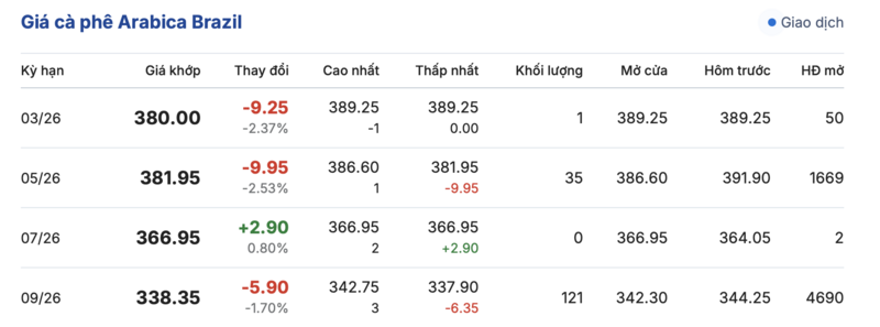 Kết thúc phiên giao dịch gần nhất, giá cà phê Arabica trên sàn Brazil cũng tiếp tục ghi nhận phiên biến động trái chiều trong các kỳ giao hàng. Cụ thể: kỳ hạn tháng 3/2026 đạt mức 380,0 cent/lb, đảo chiều giảm sâu 9,25 cent/lb so với hôm qua. Trái chiều, kỳ giao hàng tháng 7/2026 ghi nhận tăng nhẹ 2,9 cent/lb, lên mức 366,95 cent/lb.