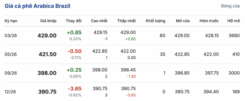Kết thúc phiên giao dịch gần nhất, cà phê Arabica Brazil ghi nhận tăng giảm đan xen trong các kỳ giao hàng. Cụ thể: kỳ hạn tháng 3/2026 đạt mức 429,0 cent/lb, tăng nhẹ 0,85 cent/lb so với hôm qua. Kỳ giao hàng tháng 12/2026 lại giảm nhẹ 3,65 cent/lb, đạt mức 390,75 cent/lb.