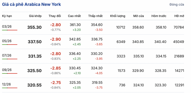 Trên sàn New York, giá cà phê Arabica lại ghi nhận phiên giảm giá liên tục trong các kỳ giao hàng. Cụ thể, kỳ giao tháng 3/2026 giảm nhẹ 2,8 cent/lb, đạt mức 355,3 cent/lb. Tương tự, hợp đồng giao tháng 12/2026 cũng giảm tiếp 2,75 cent/lb, đạt mức 320,55 cent/lb.