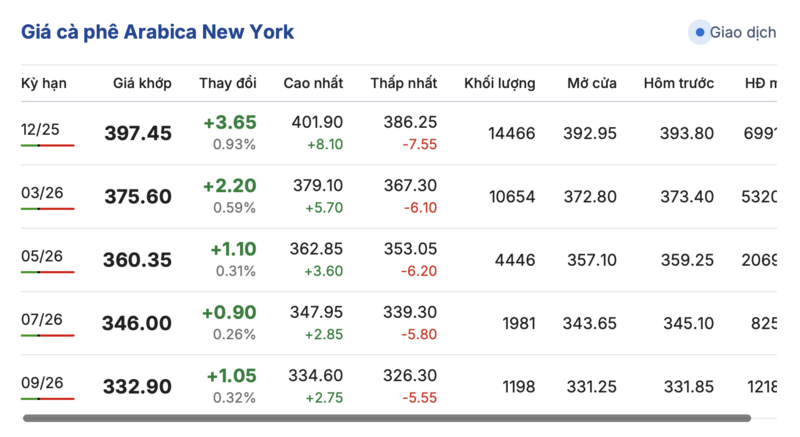 Trên sàn New York, giá cà phê Arabica giao tháng 12/2025 tăng 0,93% (3,65 US cent/pound), ở mức 397,45 US cent/pound. Kỳ giao tháng 3/2026 tăng 0,59% (2,2 US cent/pound), hiện ở mức 371,15 US cent/pound.