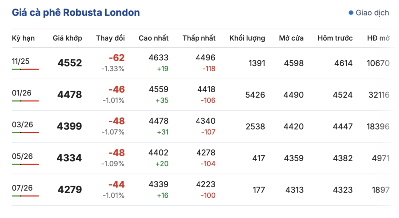 Kết thúc phiên giao dịch gần nhất, giá cà phê Robusta tại sàn London đồng loạt giảm. Cụ thể, hợp đồng kỳ giao tháng 11/2025 giảm 1,33% (62 USD/tấn), ở mức 4552 USD/tấn. Kỳ giao tháng 1/2026 giảm 1,01% (46 USD/tấn), ở mức 4478 USD/tấn.