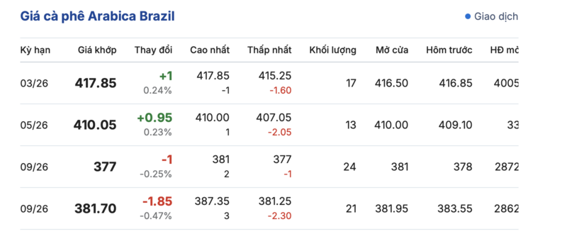 Kết thúc phiên giao dịch gần nhất, giá cà phê Arabica Brazil biến động trái chiều so với phiên giao dịch trước. Cụ thể: kỳ giao hàng tháng 12/2025 đạt mức 417,85 cent/lb, tăng 1,0 cent/lb so với hôm qua. Kỳ giao hàng tháng 9/2026 lại giảm nhẹ 1,85 cent/lb, đạt mức 381,7 cent/lb.