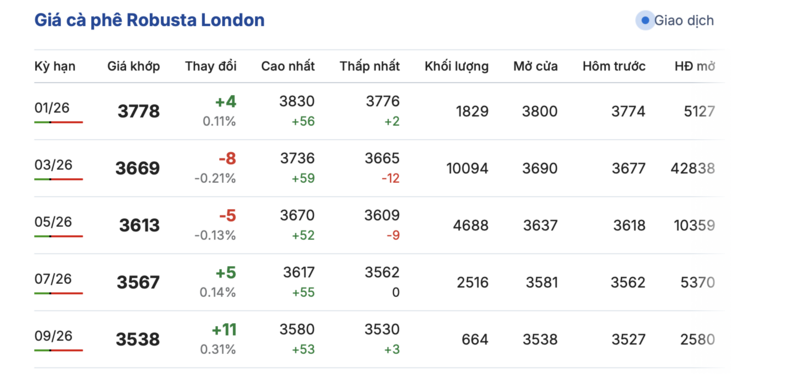 Kết thúc phiên giao dịch gần nhất, giá cà phê Robusta tại London biến động trái chiều các kỳ giao hàng. Cụ thể, kỳ giao tháng 1/2026 tăng 4,0 USD/tấn, lên mức 3778 USD/tấn. Hợp đồng giao kỳ hạn tháng 9/2026 cũng tăng 11 USD/tấn, lên mức 3538 USD/tấn.