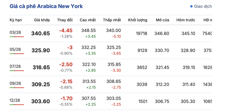 Trái lại, trên sàn New York, giá cà phê Arabica cũng ghi nhận giảm liên tục trong các kỳ giao hàng. Cụ thể, kỳ giao tháng 3/2025 giảm nhẹ 4,45 cent/lb, đạt mức 340,65 cent/lb. Hợp đồng giao tháng 12/2026 giảm 1,7 cent/lb, đạt mức 303,6 cent/lb.