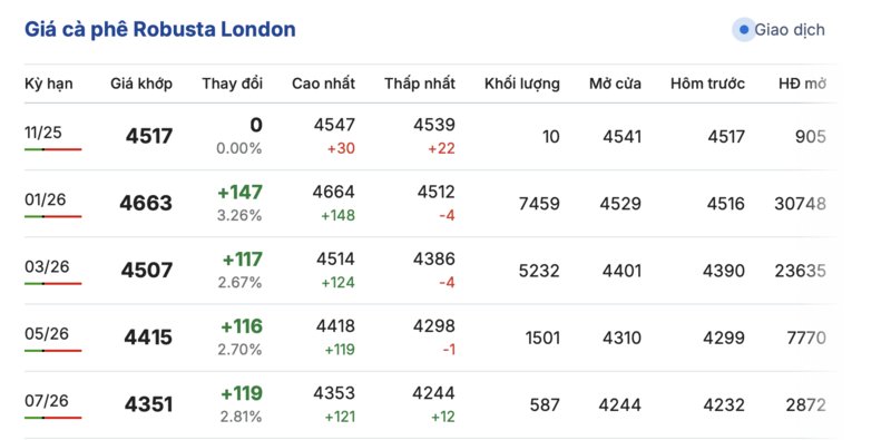 Kết thúc phiên giao dịch gần nhất, giá cà phê Robusta tại London tăng đồng loạt qua các kỳ giao hàng. Cụ thể, kỳ giao tháng 1/2026 tăng mạnh 147 USD/tấn, đạt mức 4663 USD/tấn. Trong khi hợp đồng giao kỳ hạn tháng 7/2026 tăng 119 USD/tấn, đạt mức 4351 USD/tấn.