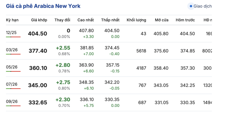 Trong khi đó, trên sàn New York, giá cà phê Arabica cũng ghi nhận sự tăng giá đồng loạt trong các kỳ giao hàng. Kỳ giao tháng 3/2026 tăng 2,55 cent/lb, lên mức 377,4 cent/lb. Hợp đồng giao tháng 9/2026 cũng tăng 2,3 cent/lb, đạt mức 332,65 cent/lb.