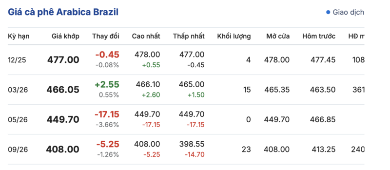 Kết thúc phiên giao dịch gần nhất, giá cà phê Arabica Brazil biến động trái chiều so với phiên giao dịch trước. Cụ thể: kỳ giao hàng tháng 12/2025 là 477,0 cent/lb, giảm 0,45 cent/lb so với phiên giao dịch trước. Kỳ giao hàng tháng 9/2026 giảm 5,25 cent/lb, xuống mức 408,0 cent/lb.
