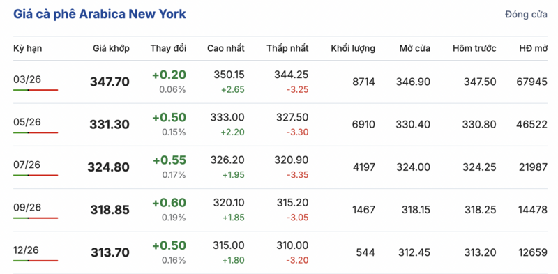 Trong khi đó, trên sàn New York, giá cà phê Arabica lại ghi nhận phục hồi trong các kỳ giao hàng. Cụ thể, kỳ giao tháng 3/2026 đảo chiều tăng nhẹ 0,2 cent/lb, đạt mức 347,7 cent/lb. Tương tự, hợp đồng giao tháng 12/2026 cũng tăng nhẹ 0,5 cent/lb, đạt mức 313,7 cent/lb.