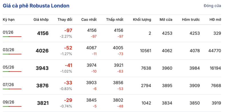 Kết thúc phiên giao dịch gần nhất, giá cà phê Robusta tại London ghi nhận phiên giảm giá liên tục trong các kỳ giao hàng. Cụ thể, kỳ giao tháng 1/2026 giảm mạnh 97 USD/tấn, xuống mức 4156 USD/tấn. Trong khi đó, hợp đồng giao kỳ hạn tháng 9/2026 tiếp tục giảm 29 USD/tấn, đạt mức 3821 USD/tấn.