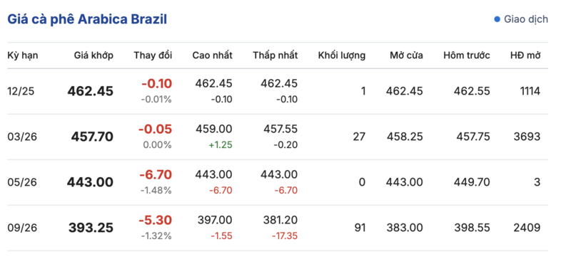 Kết thúc phiên giao dịch gần nhất, giá cà phê Arabica Brazil cũng giảm đồng loạt so với phiên giao dịch trước. Cụ thể: kỳ giao hàng tháng 12/2025 là 462,45 cent/lb, giảm 0,1 cent/lb so với phiên giao dịch trước. Kỳ giao hàng tháng 9/2026 giảm 5,3 cent/lb, xuống mức 393,25 cent/lb.