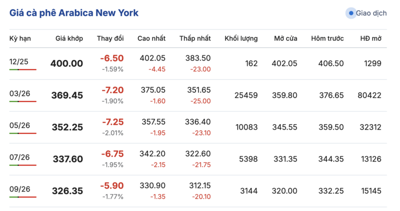 Trong khi đó, trên sàn New York, giá cà phê Arabica cũng ghi nhận sự giảm giá đồng loạt trong các kỳ giao hàng. Kỳ giao tháng 12/2025 giảm 6,5 cent/lb, xuống mức 400,0 cent/lb. Hợp đồng giao tháng 9/2026 cũng giảm 5,9 cent/lb, đạt mức 326,25 cent/lb.