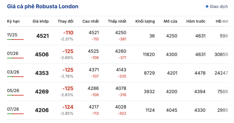 Kết thúc phiên giao dịch gần nhất, giá cà phê Robusta tại London giảm đồng loạt qua các kỳ giao hàng. Cụ thể, kỳ giao tháng 12/2025 giảm mạnh 110 USD/tấn, đạt mức 4521 USD/tấn. Trong khi hợp đồng giao kỳ hạn tháng 7/2026 giảm 124 USD/tấn, đạt mức 4206 USD/tấn.