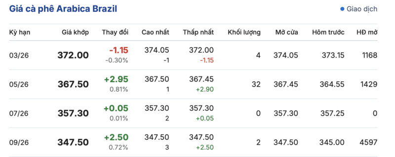 Kết thúc phiên giao dịch gần nhất, cà phê Arabica Brazil ghi nhận phiên biến động trái chiều trong các kỳ giao hàng. Cụ thể: kỳ hạn tháng 3/2026 đạt mức 372,0 cent/lb, đảo chiều giảm 1,15 cent/lb so với hôm qua. Trái lại, kỳ giao hàng tháng 9/2026 lại ghi nhận tăng nhẹ 2,5 cent/lb, lên mức 347,5 cent/lb.