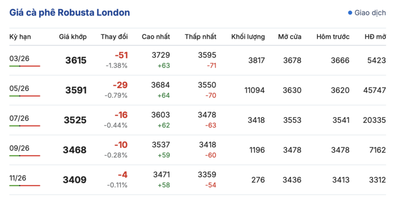 Kết thúc phiên giao dịch gần nhất, giá cà phê Robusta tại London ghi nhận giảm nhẹ đồng loạt trong các kỳ giao hàng. Cụ thể, kỳ giao tháng 1/2026 giảm nhẹ 51 USD/tấn, đạt mức 3615 USD/tấn. Trong khi đó, hợp đồng giao kỳ hạn tháng 11/2026 cũng giảm 4,0 USD/tấn, xuống mức 3409 USD/tấn.