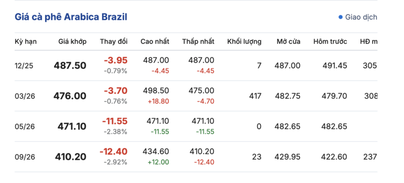 Kết thúc phiên giao dịch, giá cà phê Arabica Brazil cũng giảm đồng loạt so với phiên giao dịch hôm qua, dao động từ 410,2 - 487,5 cent/lb. Cụ thể: kỳ giao hàng tháng 12/2025 là 487,5 cent/lb, giảm nhẹ 0,79% so với phiên giao dịch trước. Kỳ giao hàng tháng 9/2026 giảm 2,92%, xuông mức 410,2 cent/lb.