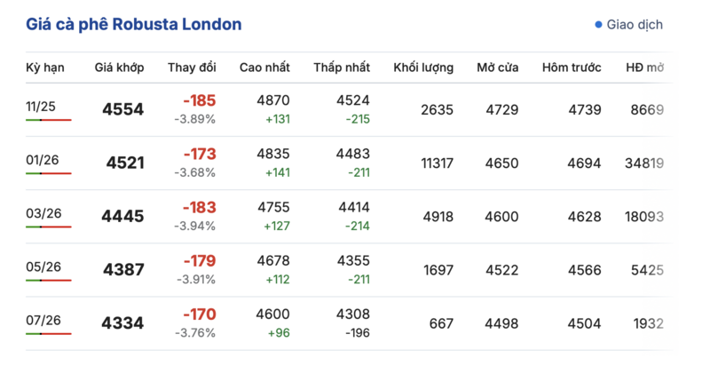 Kết thúc phiên giao dịch gần nhất, giá cà phê Robusta tại London giao tháng 11/2025 giảm 185 USD/tấn, xuống mức 4.554 USD/tấn. Hợp đồng giao tháng kỳ hạn tháng 1/2026 giảm 173 USD/tấn, ở mức 4.521 USD/tấn.