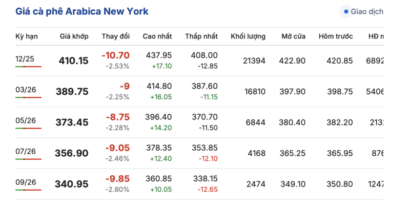 Tương tự, trên sàn New York, giá cà phê Arabica giao tháng 12/2025 giảm 10,7 cent/lb, xuống mức 410.15 cent/lb. Hợp đồng giao tháng 9/2026 giảm 9,85 cent/lb, xuống mức 340,95 cent/lb.