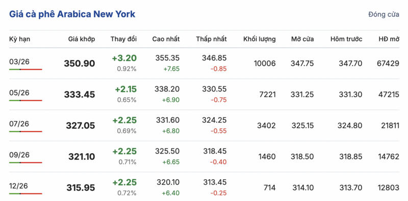 Trong khi đó, trên sàn New York, giá cà phê Arabica cũng ghi nhận phiên tăng giá liên tục trong các kỳ giao hàng. Cụ thể, kỳ giao tháng 3/2026 đảo chiều tăng nhẹ 3,2 cent/lb, đạt mức 350,9 cent/lb. Tương tự, hợp đồng giao tháng 12/2026 cũng tăng nhẹ 2,25 cent/lb, đạt mức 315,95 cent/lb.