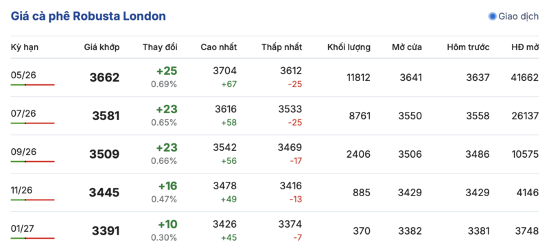 Cụ thể, trên sàn giao dịch London, giá cà phê Robusta sáng nay ghi nhận tăng nhẹ trong các kỳ giao hàng. Trong đó, kỳ giao tháng 3/2026 đảo chiều tăng nhẹ 25 USD/tấn, đạt mức 3.662 USD/tấn. Tương tự, hợp đồng giao kỳ hạn tháng 11/2026 cũng đảo chiều tăng nhẹ 16 USD/tấn, lên mức 3.445 USD/tấn.