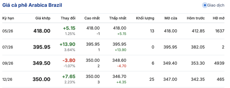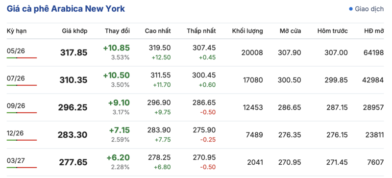 Trong khi đó, trên sàn New York, giá cà phê Arabica cũng ghi nhận phiên bật tăng đồng loạt trong các kỳ giao hàng. Cụ thể, kỳ giao tháng 5/2026 tăng mạnh 10,85 cent/lb, đạt mức 317,85 cent/lb. Tương tự, hợp đồng giao tháng 3/2027 tăng thêm 6,2 cent/lb, đạt mức 277,65 cent/lb.