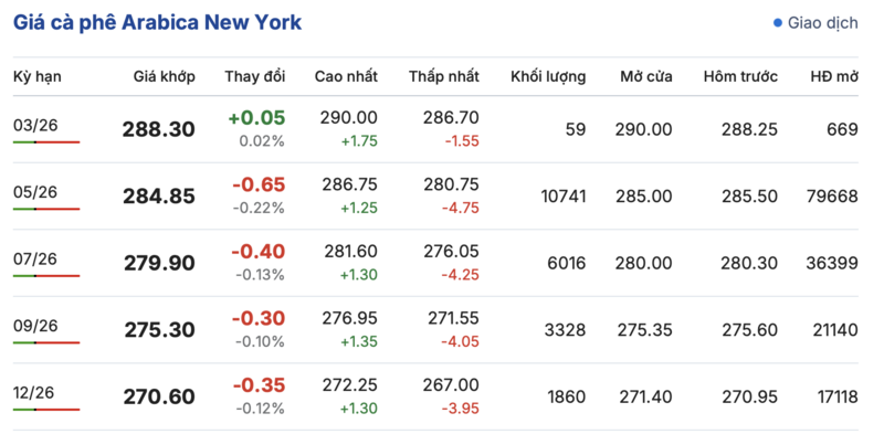 Trên sàn New York, giá cà phê Arabica lại ghi nhận phiên biến động trái chiều trong các kỳ giao hàng. Cụ thể, kỳ giao tháng 3/2026 đảo chiều tăng nhẹ 0,05 cent/lb, lên mức 288,3 cent/lb. Trái lại, hợp đồng giao tháng 12/2026 giảm nhẹ 0,35 cent/lb, đạt mức 270,6 cent/lb.
