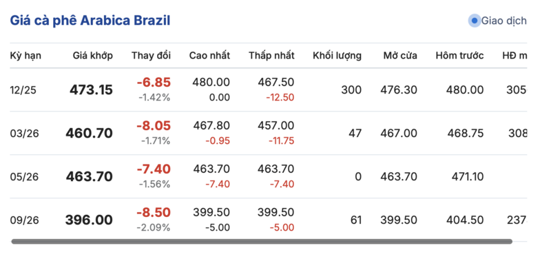 Kết thúc phiên giao dịch gần nhất, giá cà phê Arabica Brazil cũng giảm đồng loạt so với phiên giao dịch trước, dao động từ 396,0 - 473,15 cent/lb. Cụ thể: kỳ giao hàng tháng 12/2025 là 473,15 cent/lb, giảm 6,85 so với phiên giao dịch trước. Kỳ giao hàng tháng 9/2026 giảm 8,5%, xuống mức 396,0 cent/lb.