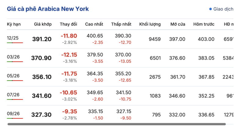 Tương tự, trên sàn New York, giá cà phê Arabica giao tháng 12/2025 giảm 11,8 cent/lb, xuống mức 391,2 cent/lb. Hợp đồng giao tháng 9/2026 giảm 9,35 cent/lb, xuống mức 327,3 cent/lb.