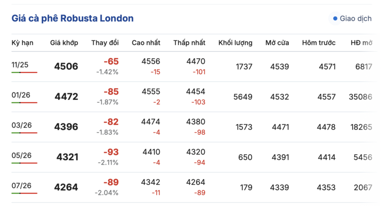 Kết thúc phiên giao dịch gần nhất, giá cà phê Robusta tại London có xu hướng sụt giảm. Cụ thể, kỳ giao tháng 11/2025 giảm 65 USD/tấn, đạt mức 4.506 USD/tấn. Hợp đồng giao tháng kỳ hạn tháng 1/2026 giảm 85 USD/tấn, ở mức 4.472 USD/tấn.