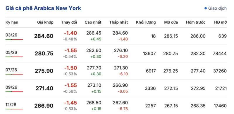 Trên sàn New York, giá cà phê Arabica ghi nhận phiên giảm đồng loạt trong các kỳ giao hàng. Cụ thể, kỳ giao tháng 3/2026 tiếp tục giảm nhẹ 1,4 cent/lb, xuống mức 284,6 cent/lb. Cùng chiều, hợp đồng giao tháng 12/2026 cũng giảm nhẹ 1,45 cent/lb, đạt mức 266,9 cent/lb.