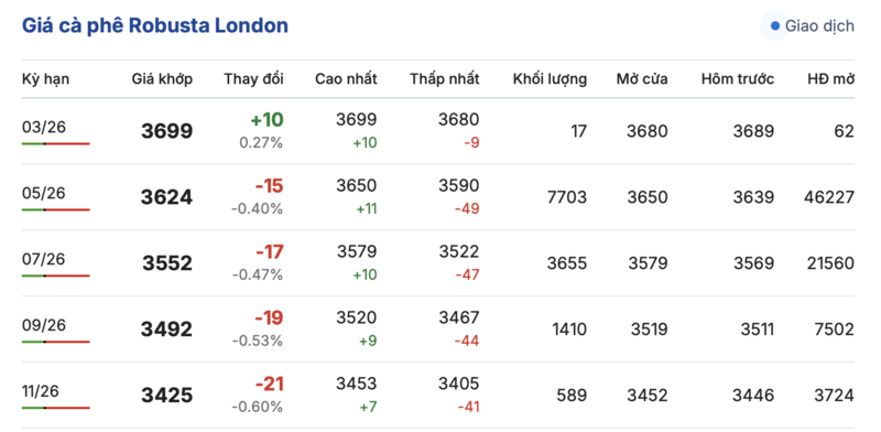 Cụ thể, kết thúc phiên giao dịch gần nhất, giá cà phê Robusta tại London ghi nhận phiên tăng giảm đan xen trong các kỳ giao hàng. Cụ thể, kỳ giao tháng 1/2026đảo chiều tăng nhẹ 10 USD/tấn, đạt mức 3699 USD/tấn. Trong khi đó, hợp đồng giao kỳ hạn tháng 11/2026 lại giảm 21 USD/tấn, xuống mức 3425 USD/tấn.