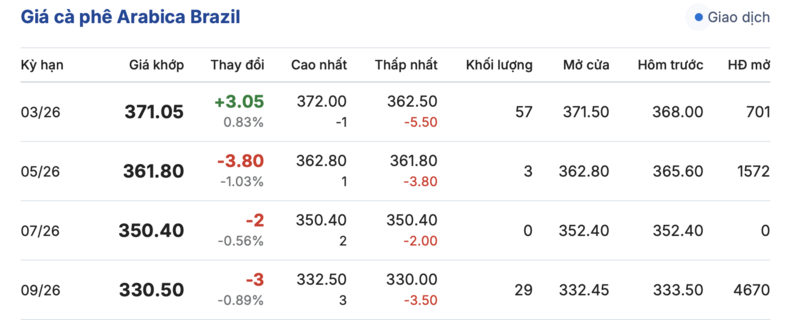 Kết thúc phiên giao dịch gần nhất, giá cà phê Arabica trên sàn Brazil tiếp tục ghi nhận phiên biến động trái chiều trong các kỳ giao hàng. Cụ thể: kỳ hạn tháng 3/2026 đạt mức 371,05 cent/lb, đảo chiều tăng thêm 3,05 cent/lb so với hôm qua. Trái lại, kỳ giao hàng tháng 9/2026 lại ghi nhận giảm nhẹ 3,0 cent/lb, xuống mức 330,5 cent/lb.