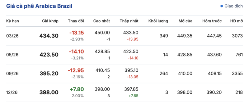 Kết thúc phiên giao dịch gần nhất, cà phê Arabica Brazil ghi nhận biến động trái chiều trong các kỳ giao hàng. Cụ thể: kỳ hạn tháng 3/2026 đạt mức 434,3 cent/lb, giảm sâu 13,15 cent/lb so với hôm qua. Trái lại, kỳ giao hàng tháng 12/2026 lại ghi nhận tiếp tục tăng mạnh 7,8 cent/lb, lên mức 398,0 cent/lb.
